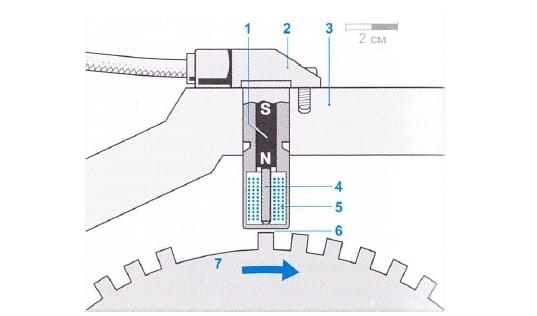 The intensity of the magnetic flux passing through the coil depends on what is opposite the sensor: the tooth or the gap between the teeth of the impulse wheel. Now the tooth causes amplification, and the gap, on the contrary, weakens the intensity of the magnetic flux.