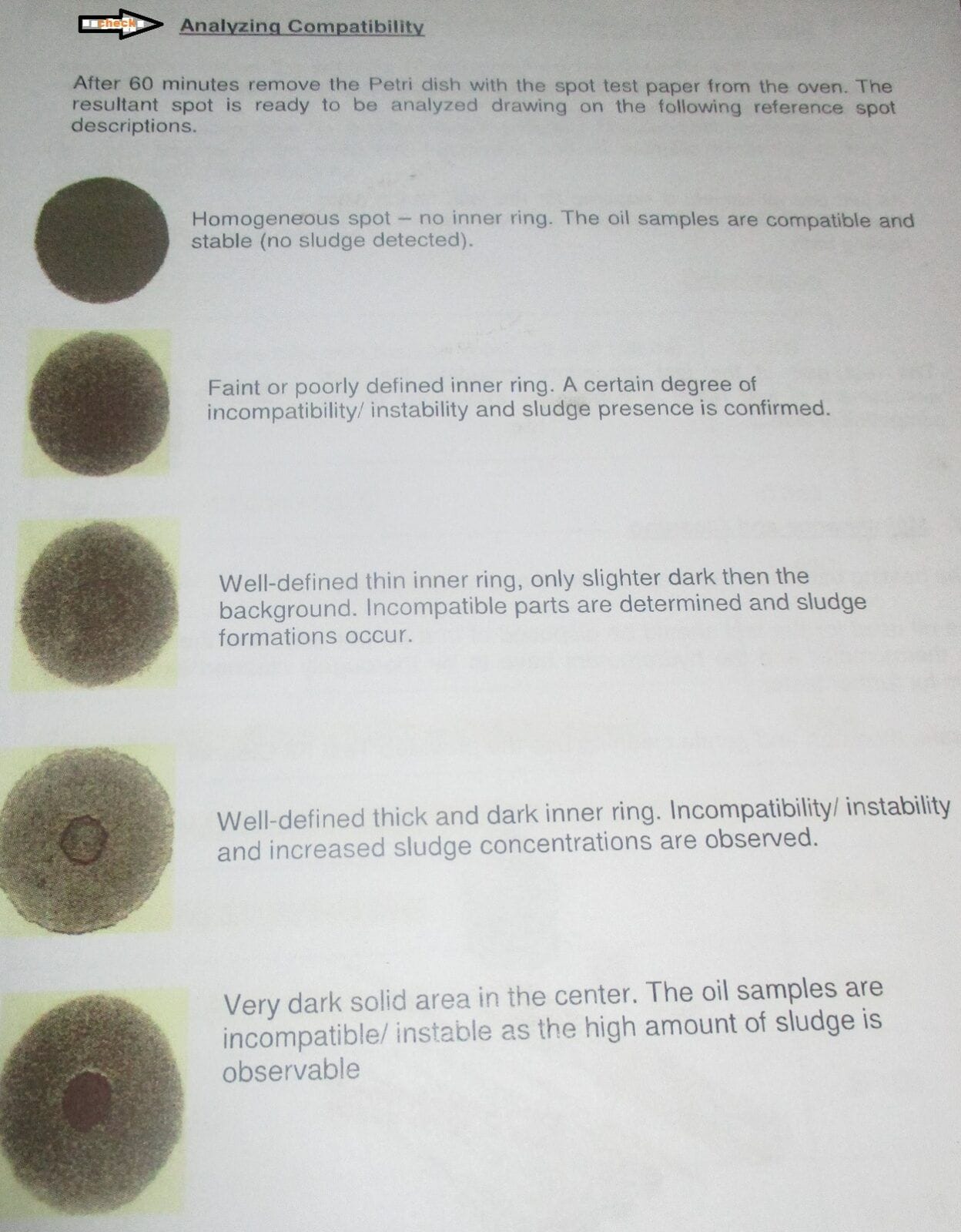 After this time, the test paper is removed from the oven and the resultant spot is examined for evidence of precipitation and rated for compatibility against D4740 reference spots.